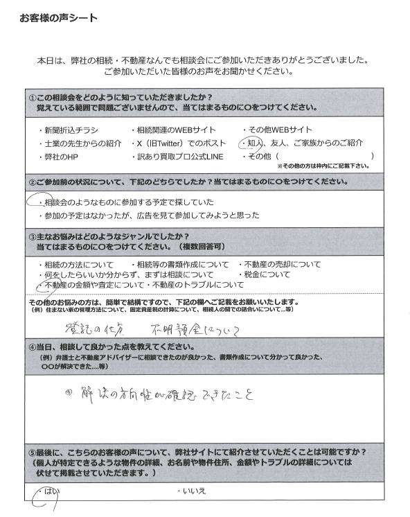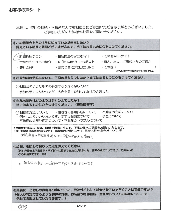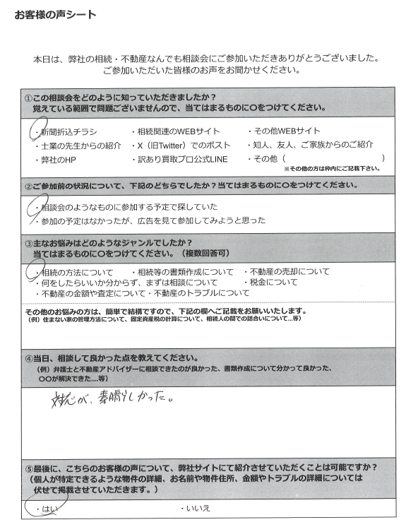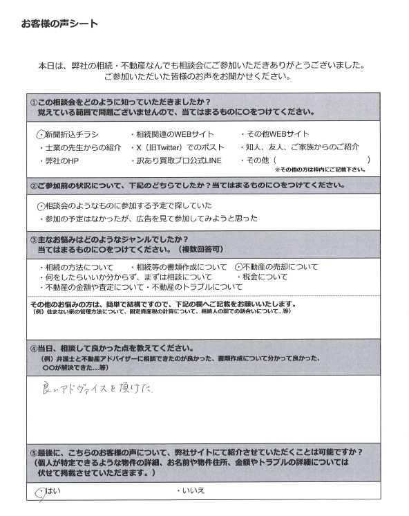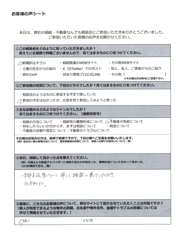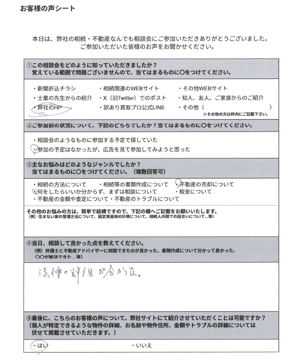 司法書士や弁護士、不動産アドバイザー等が相談員として参加しておりますので、事前にお伺いするお悩み等に合った相談員を弊社にて選定させていただきます。原則、お客様からご指名いただく形はとっておりませんので、ご了承ください。