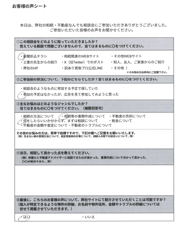 相談会では費用は発生いたしません。その後弊社への不動産売却や、引き続き士業の先生とのやり取りとなった場合には発生する可能性がございます。