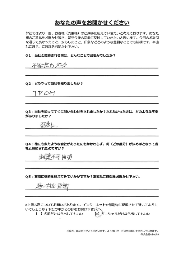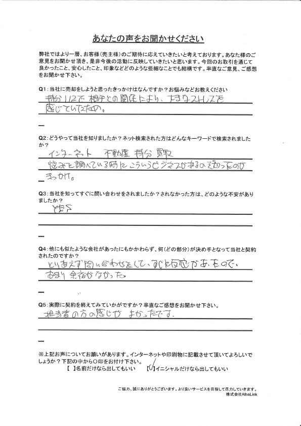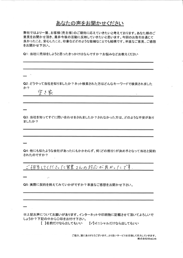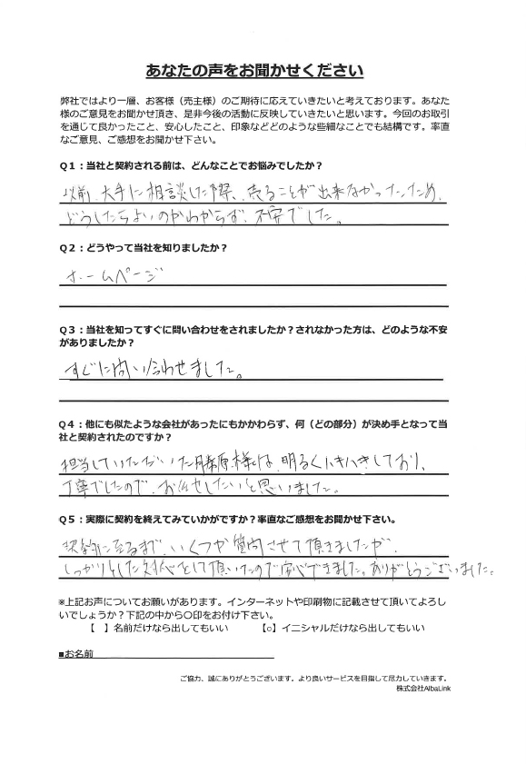 REVIEWお客様の声 問い合わせてから迅速な対応をして頂いて助かった R.Y様 担当者の分かりやすい説明、人柄、態度に感銘を受けました H.M様 不動産業者に「キレイにしないと売れない」と言われていて悩んでいた R.I様 断られる心配もしていたけれど、対応の速さにおどろきました K.I様 質問にもしっかりと対応して頂いたので、安心でできました J.A様 あまり余裕がないなか、問い合わせ後すぐに対応していただけました K.T様 TVCMを見て問い合わせましたが、速い対応に感謝 S.K様 ご担当してくださった営業さんの対応が良かったです K.U様 1 2 … 4 Next >