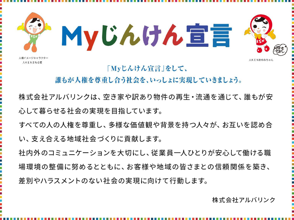 2025.07.15 法務省の「Myじんけん宣言」に賛同しました 株式会社アルバリンクは、法務省の「Myじんけん宣言」に賛同しました。以下の方針に基づき、日ごろの活動を通じて人権を尊重し、目標実現に努めます。 法務省の「Myじんけん宣言」に賛同しました