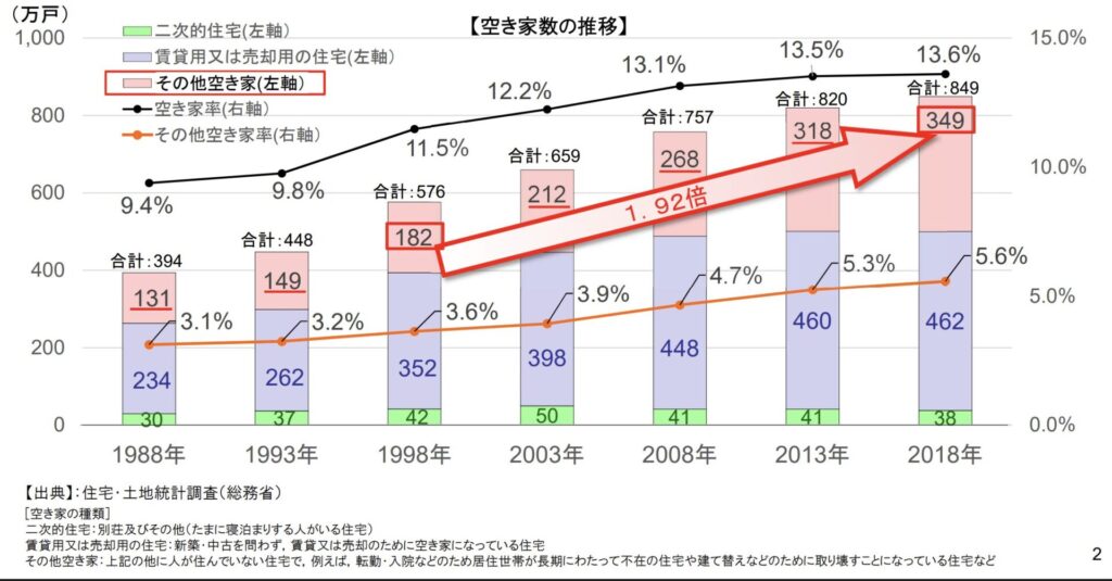 全国で空き家が増加し、住宅・土地統計調査(総務省)によれば、空き家の総数は、1998年から2018年の20年間で、で約1.5倍(576万戸→849万戸)に増えました。