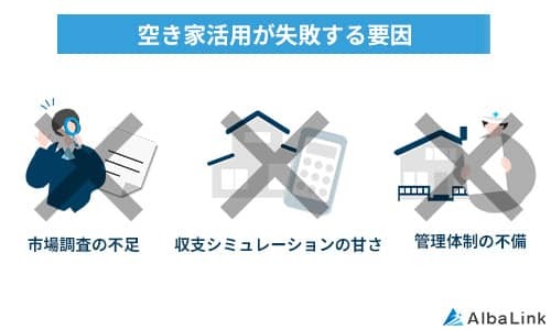 空き家活用の失敗の多くは、収支計画の甘さや需要の読み違い、専門的知識の不足が原因です。