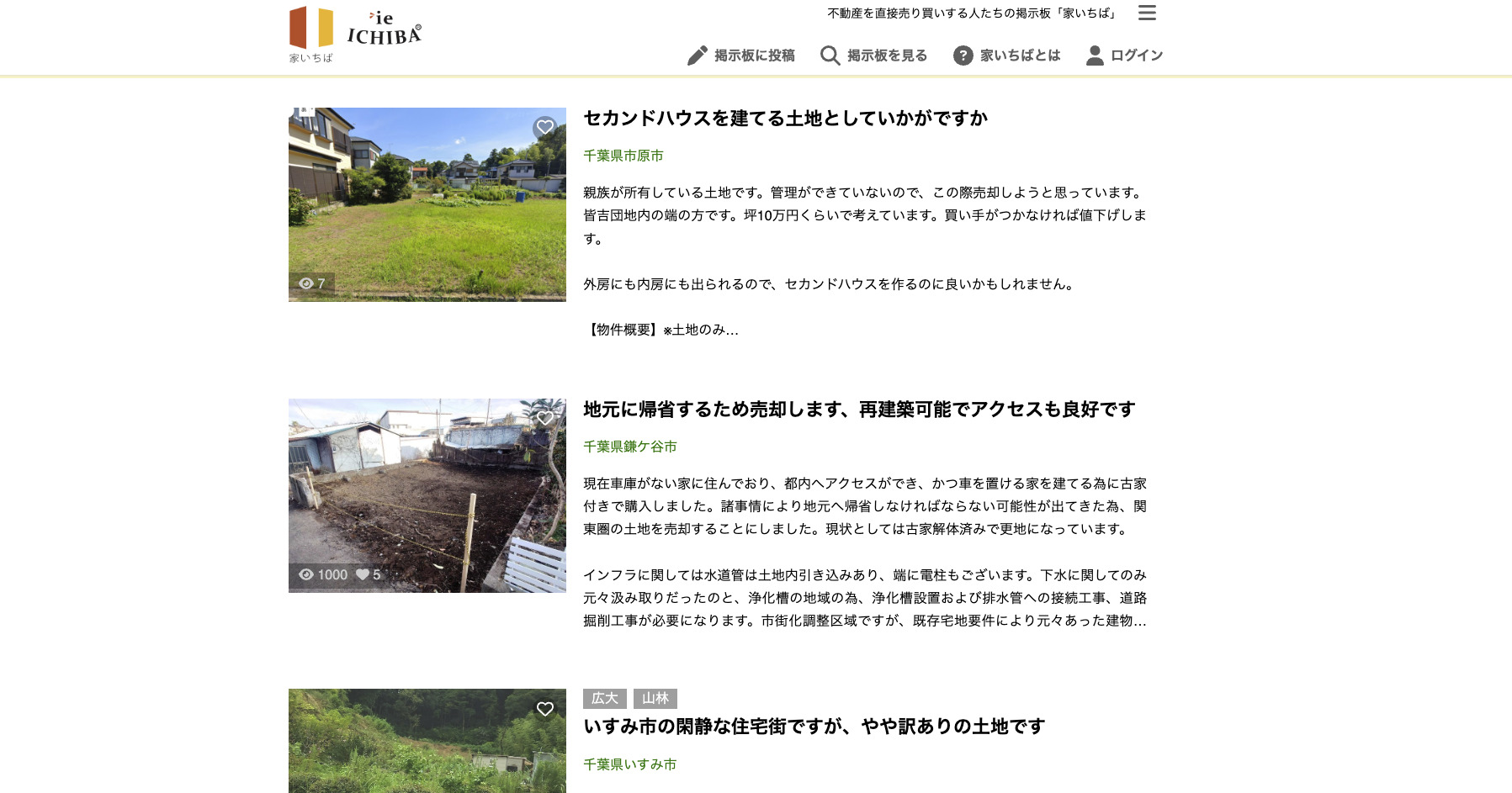 たとえば、不動産マッチングサイトの一つである「家いちば」では、千葉県の土地情報が多く掲載されています。