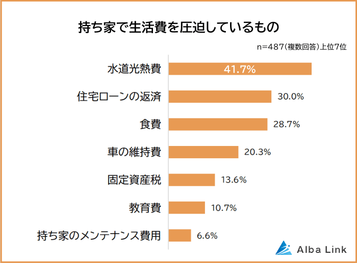 持ち家にお住まいの487人に「持ち家で生活費を圧迫しているもの」を聞いたところ、1位は「水道光熱費(41.7%)」でした。