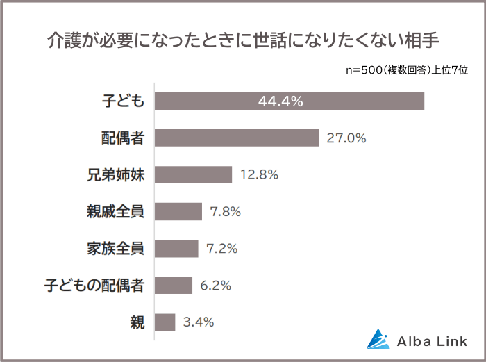 反対に、「介護が必要になったときに世話になりたくない相手」を聞いたところ、1位は「子ども(44.4%)」、2位は「配偶者(27.0%)」でした。