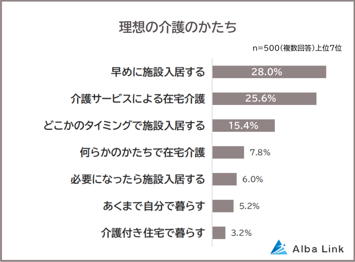 「理想の介護のかたち」として最も多かった回答は、「早めに施設入居する(28.0%)」でした。