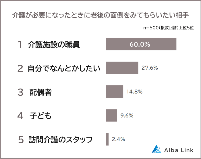 30代以上の男女500人に「介護が必要になったときに、老後の面倒をみてもらいたい相手」を聞いたところ、圧倒的1位は「介護施設の職員(60.0%)」でした。