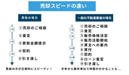 一方で、専門の不動産買取業者に依頼をすると、その買取業者が直接の買主となるため、売却のご相談から引き渡しまでが平均1か月と、非常にスピーディに進められます。