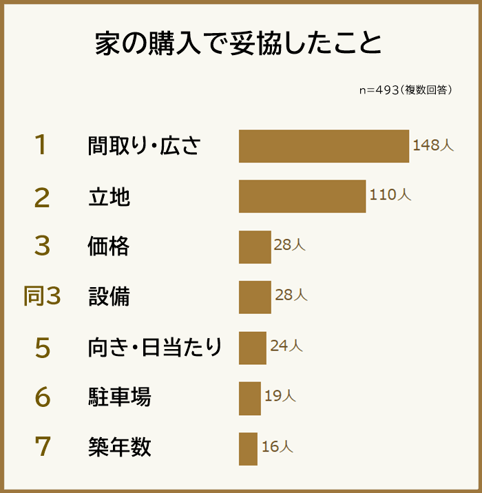 実際に弊社が行った「家の購入で妥協したことアンケート」では、日当たりは第5位となっており、妥協できていない人が多いのが実情です。