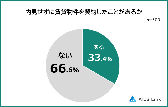 賃貸物件に住んだことがある500人に「内見せずに賃貸物件を契約したことがあるか」を聞いたところ、「ある」と回答した人は33.4%でした。