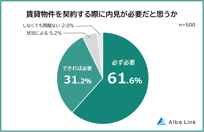 「賃貸物件を契約する際に内見が必要だと思うか?」という問いには、「必要」と回答した人が、「必ず(61.6%)」「できれば(31.2%)」を合わせて92.8%にのぼりました。