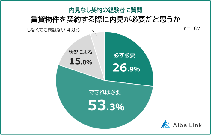 なお「内見なしで部屋を決めた経験がある人(167人)」だけに絞って集計すると、「必要」と回答した人は「必ず(26.9%)」「できれば(53.3%)」を合わせて80.2%です。