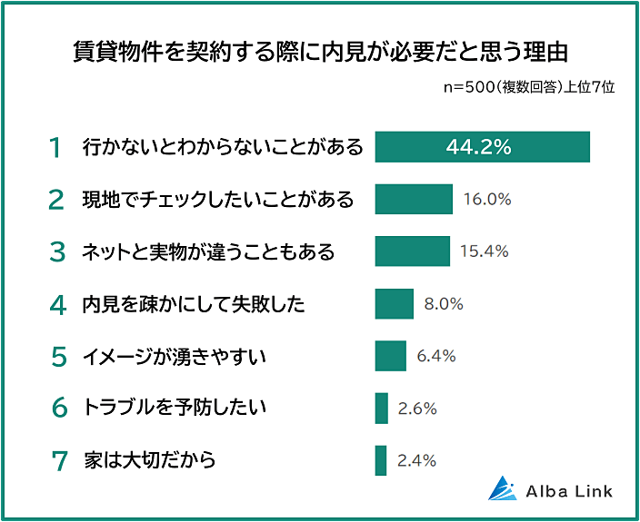 「賃貸物件を契約する際に内見が必要だと思う理由」の圧倒的1位は「行かないとわからないことがある(44.2%)」で、全体の4割を超えました。