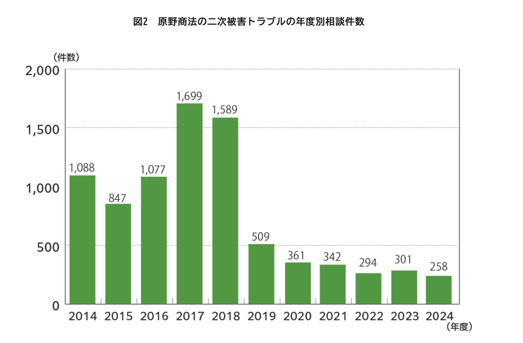 消費生活相談の件数は2018年度まで年間1,000件を超えており、2019年度以降は減少傾向にあるものの、被害はなくなっていません。