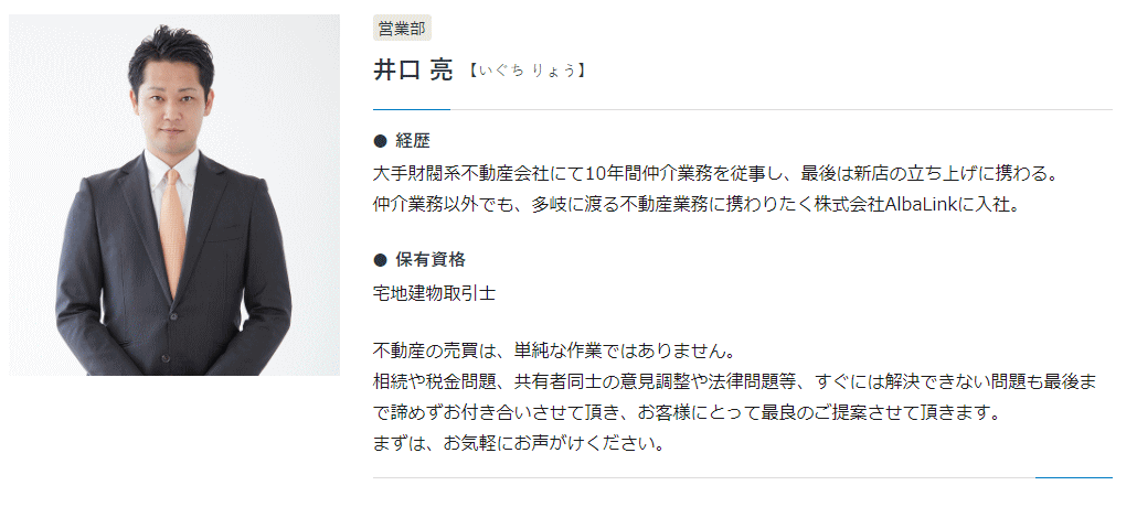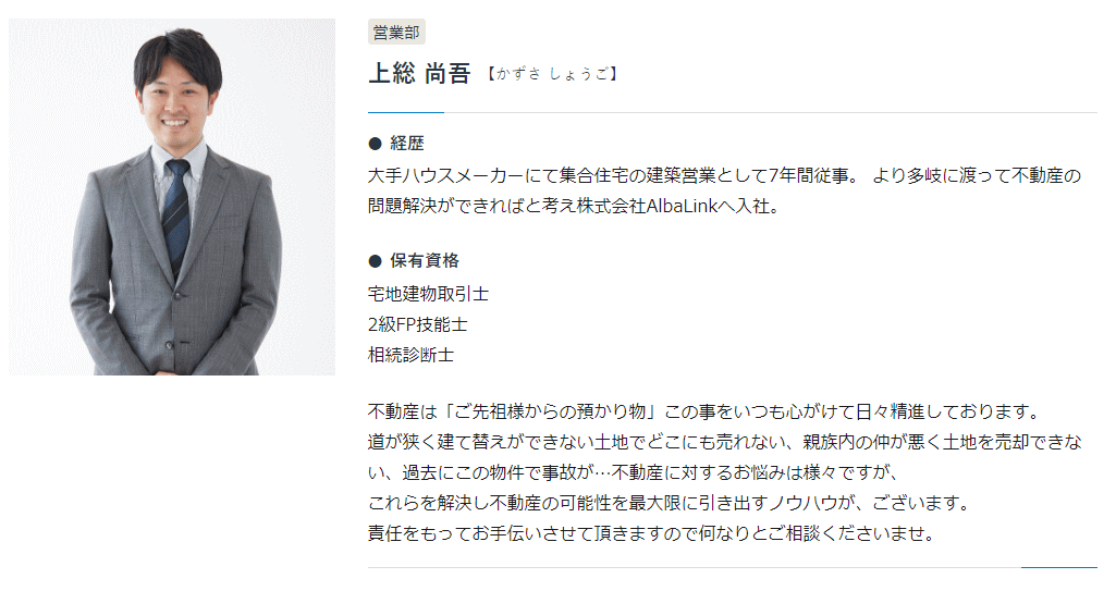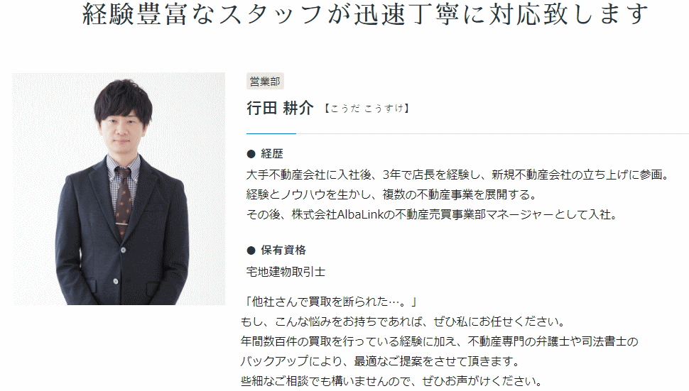 日本では、先祖代々、不動産を引き継ぐことが一般的でした。 しかし、様々な事情から次の世代が不動産を管理できない場合、手放すことが最善となることも多々あります。 そんな時に、 – 私達アルバリンクがお客様にお力添えすることで「思い」も一緒に引き継いでいきたい – このような思いで日々事業に取り組んでおります。 売りにくい不動産を専門的に扱っていることから、深く悩んでいるお客様も少なくありません。 無事に手放すことができたお客様からは「肩の荷が下りた、本当に助かった。」と涙を流して感謝のお言葉を頂くこともあります。 このようなお言葉を1人でも多くのお客様からいただくため、弊社スタッフ一同、今後も精進してまいります。