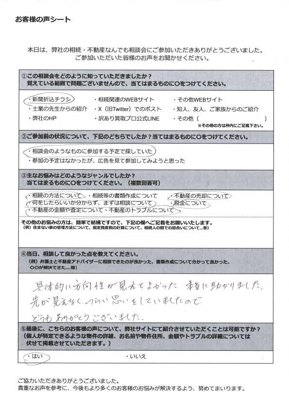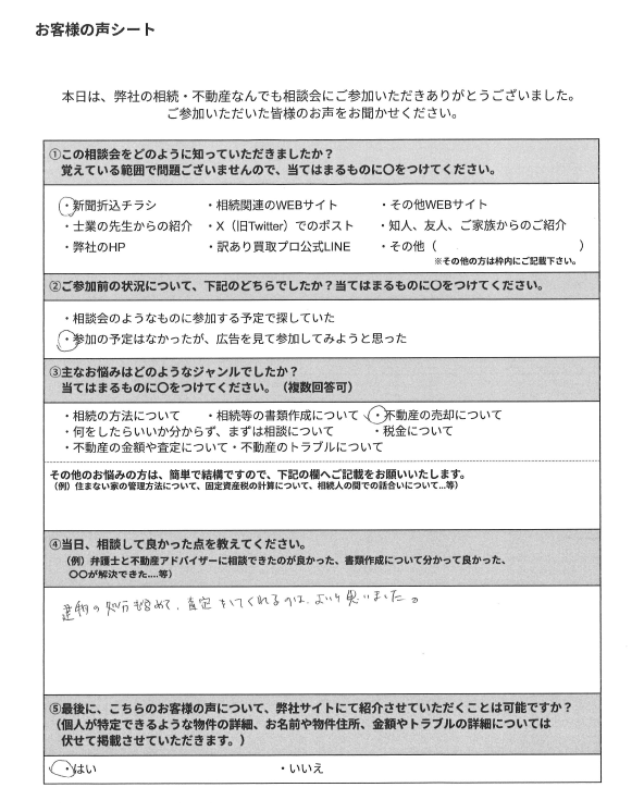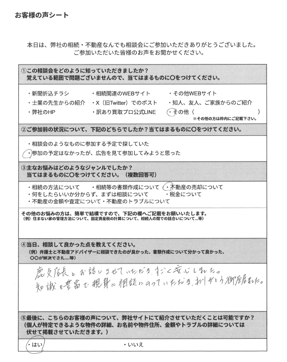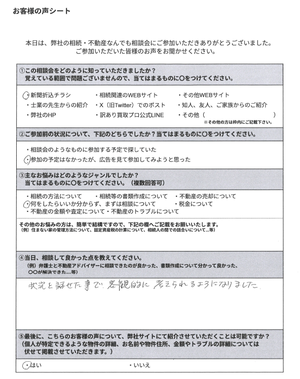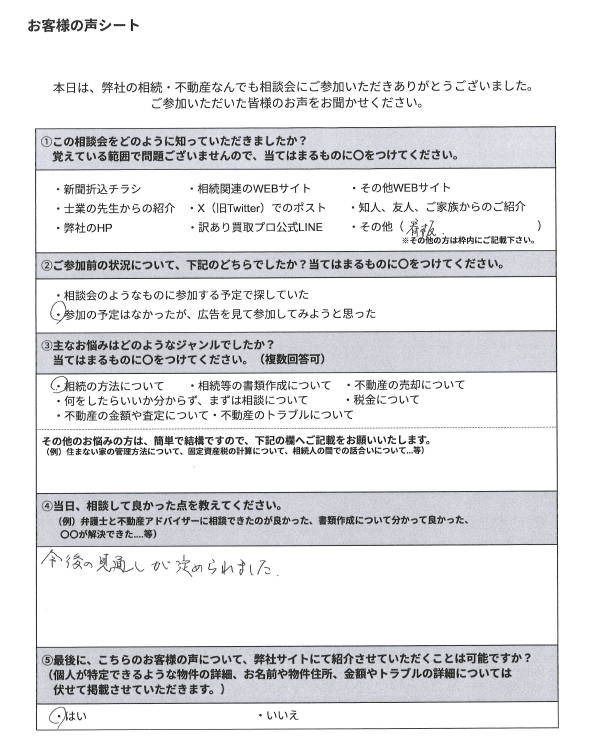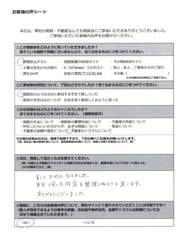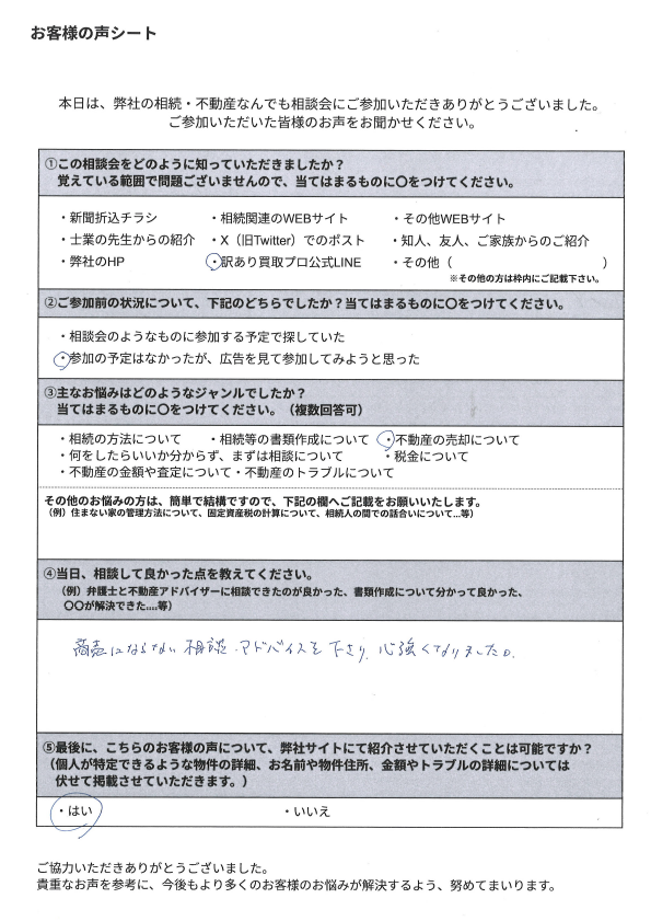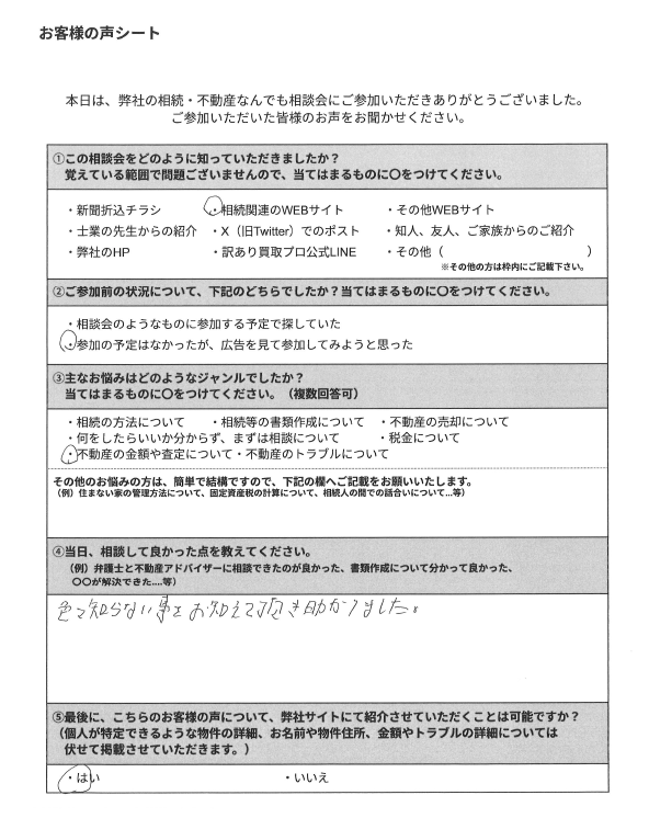 相談会では費用は発生いたしません。その後弊社への不動産売却や、引き続き士業の先生とのやり取りとなった場合には発生する可能性がございます。